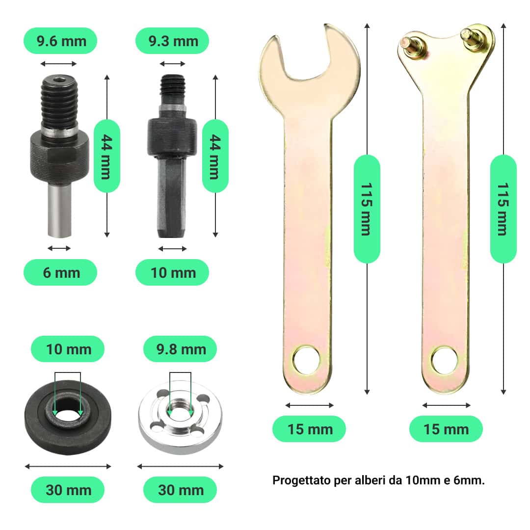 • Installazione semplice: inserire l’albero nel mandrino e serrare con la chiave. ⚙️