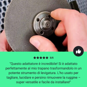 Si tratta di uno strumento piuttosto semplice. È possibile utilizzare questo strumento per adattare tutti i dischi abrasivi per smerigliatrici angolari all’uso in un trapano portatile. L’adattatore è di qualità robusta e resiste facilmente all’usura. L’adattatore viene fornito con istruzioni dettagliate e include le chiavi appropriate per stringere o sostituire rapidamente l’abrasivo.