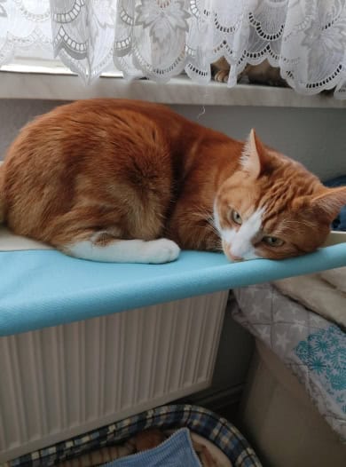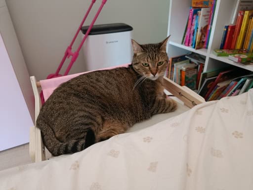 Adoro questo letto e anche il mio gatto! È piuttosto grande, ma si mette comunque facilmente a suo agio su questo letto. Potete semplicemente sganciarlo e spostarlo sul ripiano della finestra, se pensate che il vostro micio voglia prendere un po’ di sole. È anche robusto! Mi ci sono voluti circa 10 minuti per montarlo, ma una volta finito ne è valsa la pena!