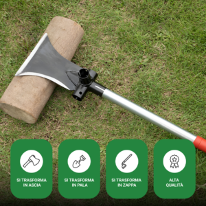 Semplicemente regolando la posizione del manico, può trasformarsi in ascia, zappa, falce o vanga.