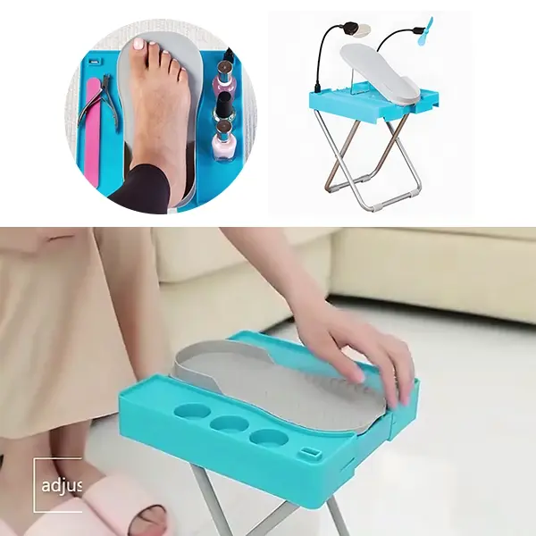 Ottieni pedicure da salone a casa con NailEase! Questo poggiapiedi regolabile offre una piattaforma stabile e comoda per dipingere le unghie senza piegarsi o allungarsi. Con luce LED integrata, ventilatore e scomparti, è perfetto per una cura delle unghie semplice e senza disordine.