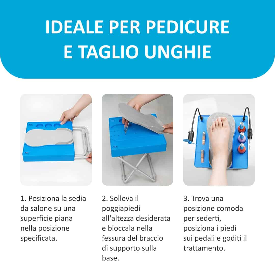 • Niente più piegamenti o stiramenti – Il poggiapiedi regolabile mantiene i piedi nella posizione perfetta per dipingere le unghie con facilità.
