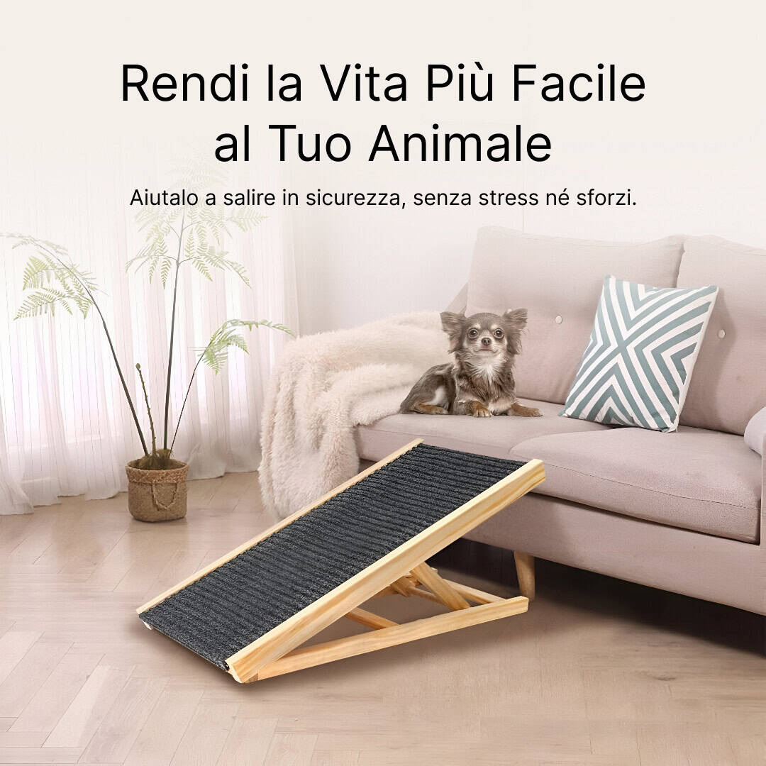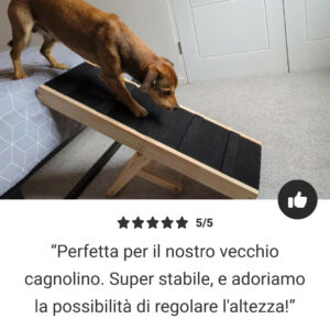 La uso da due mesi per la mia cagnolina anziana e ho notato un netto miglioramento nella mobilità: non salta più e sembra meno dolorante alle zampe. Le due regolazioni 28 e 40 cm sono utilissime per letto e auto. Si pulisce facilmente, la superficie antiscivolo funziona anche se bagnata e la struttura in legno rimane stabile. Ho apprezzato la garanzia di 14 giorni perché dava tranquillità al momento dell'acquisto, anche se non ho dovuto usarla.