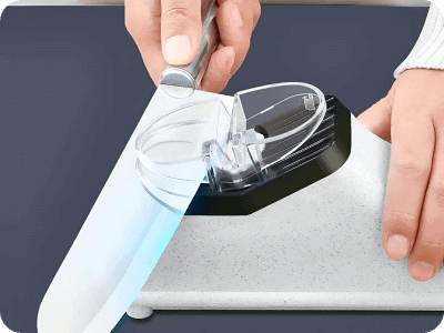 Come si usa: Inserire la lama nella fessura, allinearla con le guide angolari, accendere l’affilacoltelli elettrico Razorknife™ e tirare il coltello 2-3 volte con una pressione uniforme per ottenere un bordo affilato e professionale.